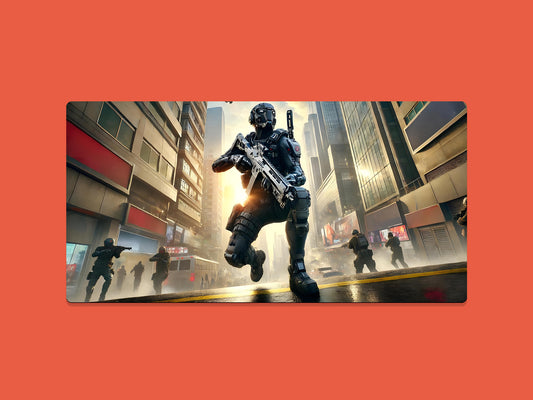 Video Game Soldier in Dystopian City Gaming Mat - Desk Mat - 3 SIZES